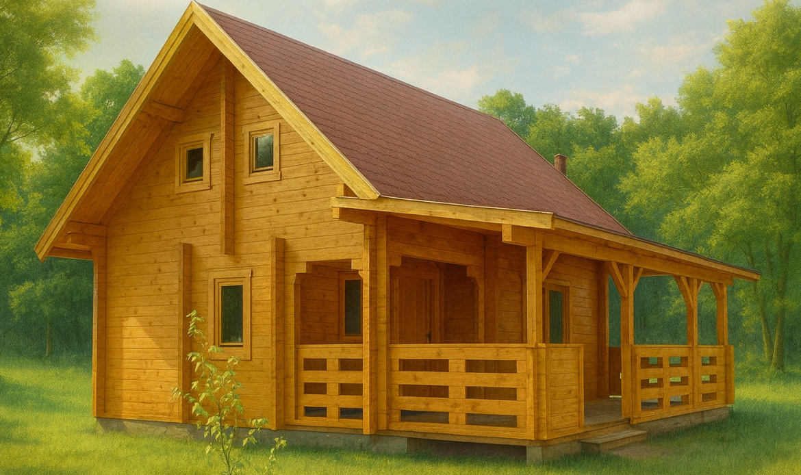 Ce chalet est une variante avec terrasse de Victoria. Proposé avec une couverture tôle imitation tuiles, la structure est également prévue pour supporter la tuile.